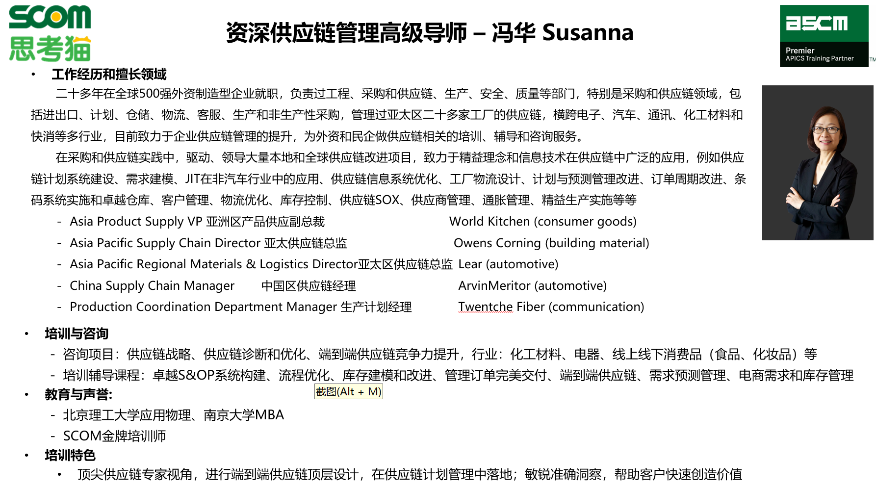 · 掌握前沿管理框架与工具: 系统学习精益与敏捷供应链的核心逻辑、适用场景及融合策略,获得在需求高度不确定下进行精准需求预测、供需平衡和端到端协同的实用方法。